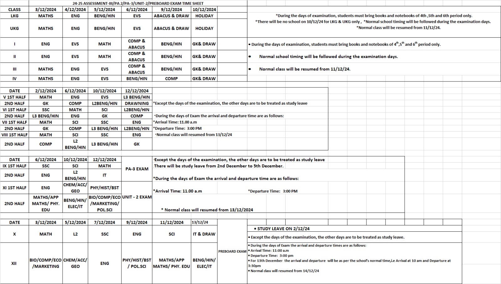 2024-25 ASSESSMENT-III/PA-2/PREBOARD EXAM  TIME SHEET DOWNLOAD