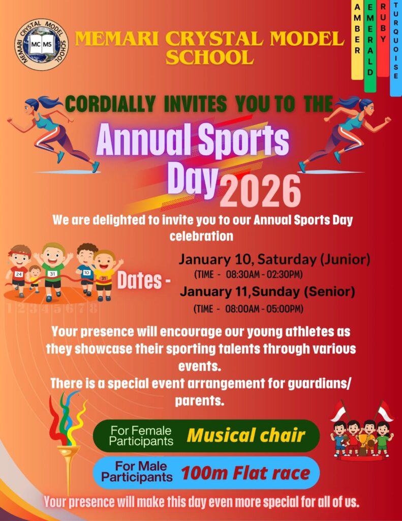| Date 09/01/2026 ANNUAL SPORTS DAY NOTICE. (For Std-5 to Std-12) Dear Parents/Guardians, We are pleased to inform you that the Annual Sports Day of the school will be conducted on 11th January 2026 (Sunday). Students are expected to participate actively in the event. Timings: Arrival: 8:00 a.m. Departure: 5:00 p.m. Important Instructions: Kindly go through the attached PDF carefully. In case of any discrepancy or missing information, please contact the respective class mentor at the earliest. Participation will be permitted only in proper House Dress. Students must carry their School Diary, I-Card, and light tiffin. No academic classes will be conducted on this day. After the conclusion of the Sports Day, guardians wishing to take their ward must produce their Parent’s I-Card. (No student will be allowed to leave without verification of the Parent’s I-Card.) Parents/Guardians are cordially invited to attend and encourage the participants on Sports Day. https://memaricrystalmodelschool.in/wp-content/uploads/2026/01/FINAL-STUDENT-LIST-FOR-STUDENT-CHECKING-2.pdf |